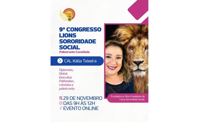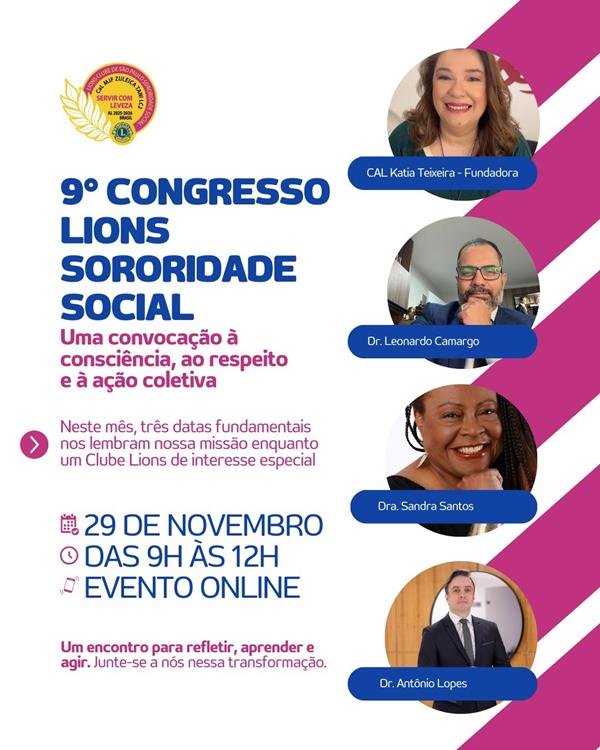 O Lions Sororidade Social, primeiro clube de interesse especial do Lions Clubs International autorizado com uma missão totalmente direcionada ao cuidado da mulher vulnerável e da mulher vítima de violência, promove no próximo dia 29 de novembro o seu evento mais importante do ano: o 9º Congresso Lions Sororidade Social.